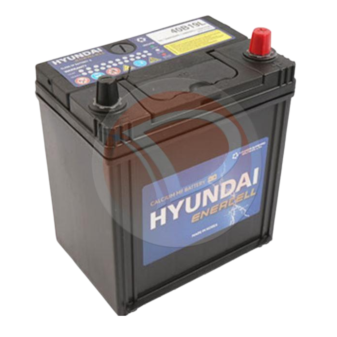 BaterÃa Hyundai 40B19L original, de 35 Amperes – 12V y 330 CCA, equipada con borne delgado y pestaña. Su diseño compacto la hace ideal para vehÃculos pequeños y de uso urbano, ofreciendo un arranque confiable y mayor durabilidad.